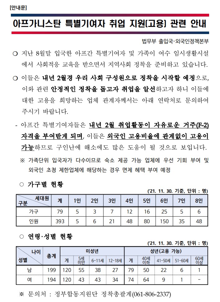 | 아프간인 특별기여자 정부합동지원단 공식 업무 개시 (0) | 2021.11.15 |